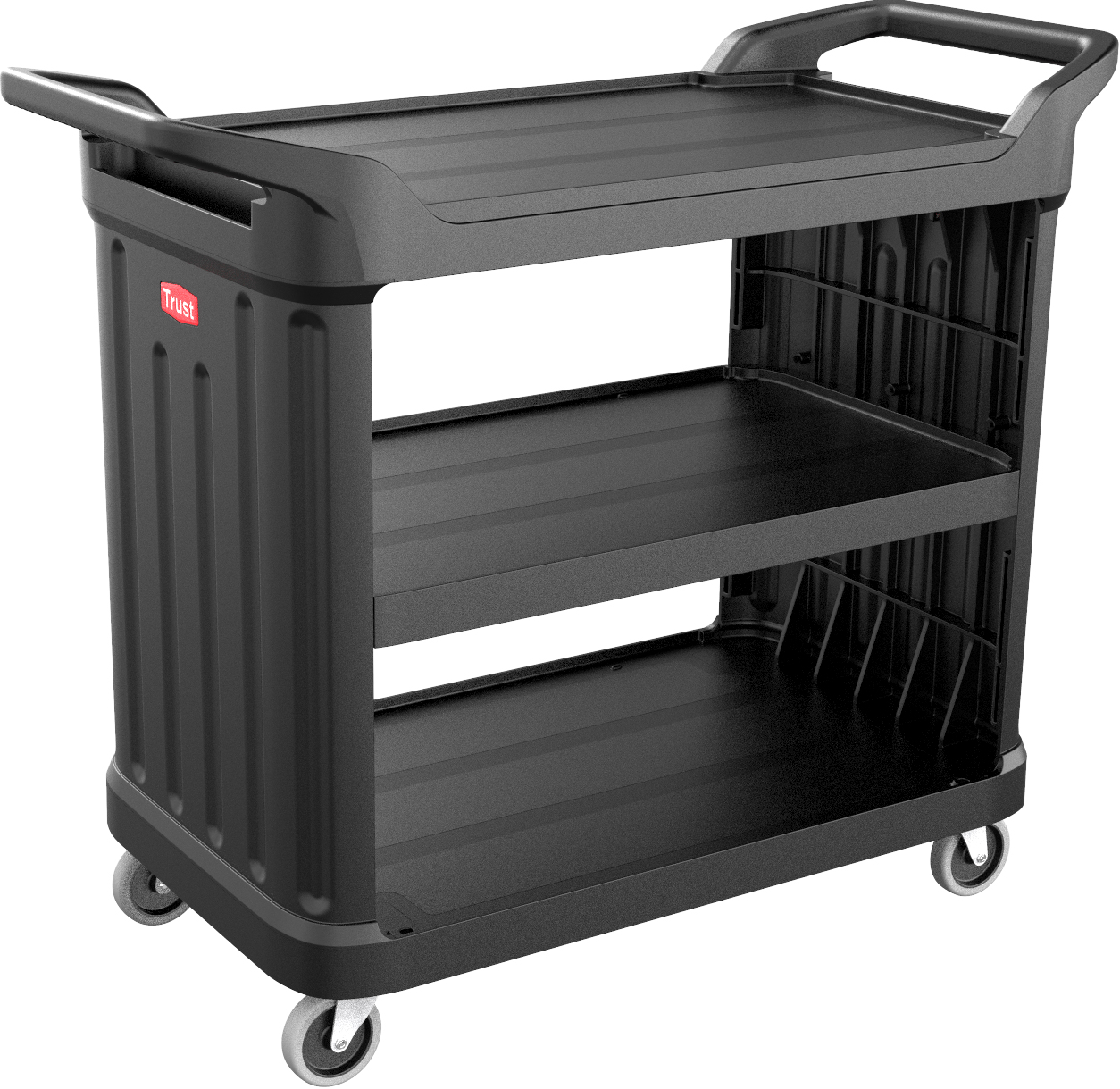 Carro multifuncional, resistente y duradero. Adecuado para trabajar tanto delante como detrás del público. Su estructura moldeada es fuerte y no se oxida, abolla ni se suelta. Cuenta con asa ergonómica que brinda un control flexible y superficie anti