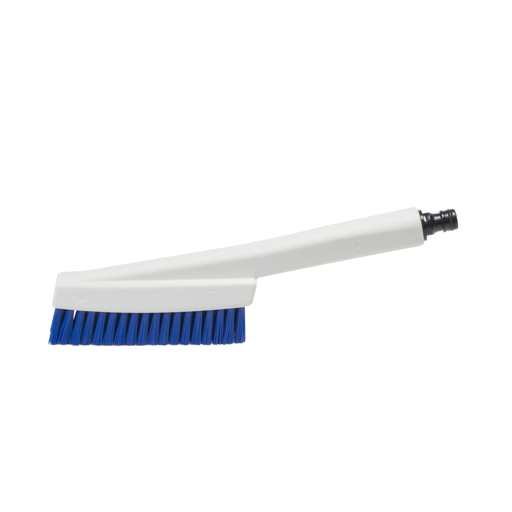 Ideal para limpieza manual de botas, previo al ingreso a plantas. Cepillo fabricado con base de poliporpileno solido con canales para flujo de líquido y fibra de PBT rígido. Cuenta con una rosca universal de ½ “ para fijar una conexión rápida a una m