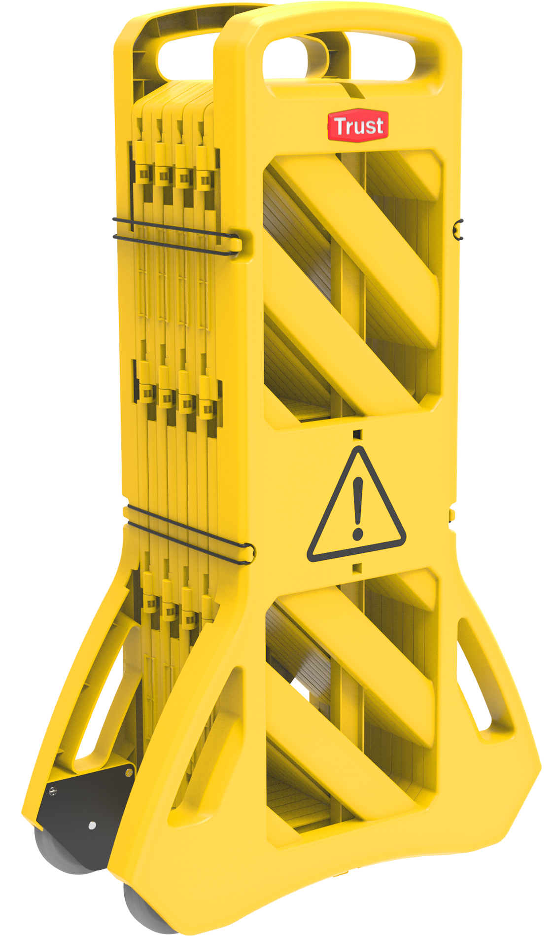 Vallas móviles para facilitar su uso, desplazamiento y almacenamiento. Para uso en interiores, los paneles flexibles permiten configuraciones rectas, curvas y circulares. Una vez plegada, la valla tiene un grosor de entre 18,4 y 34,9 cm, lo que facil